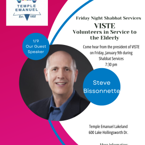 Steve Bissonnette President at VISTE – Volunteers in Service to the Elderly will be our guest speaker at Shabbat services Friday, January 9, 2026. Please join us!
