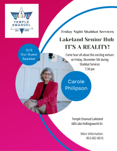 Do you know the history of trying to have a Senior Center here in Lakeland? Come learn about the past and future plans for a Lakeland Senior Hub from Carole Philipson during our Shabbat service on Friday 12/5.