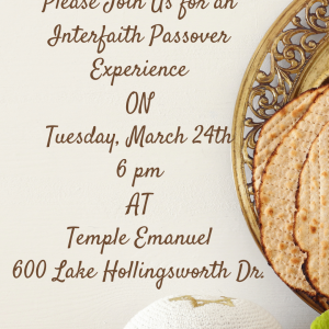 Please join us for an Interfaith Passover Experience on Tuesday March 24th at 6 pm at Temple Emanuel Please RSVP to office@templeemanuellakeland.com
