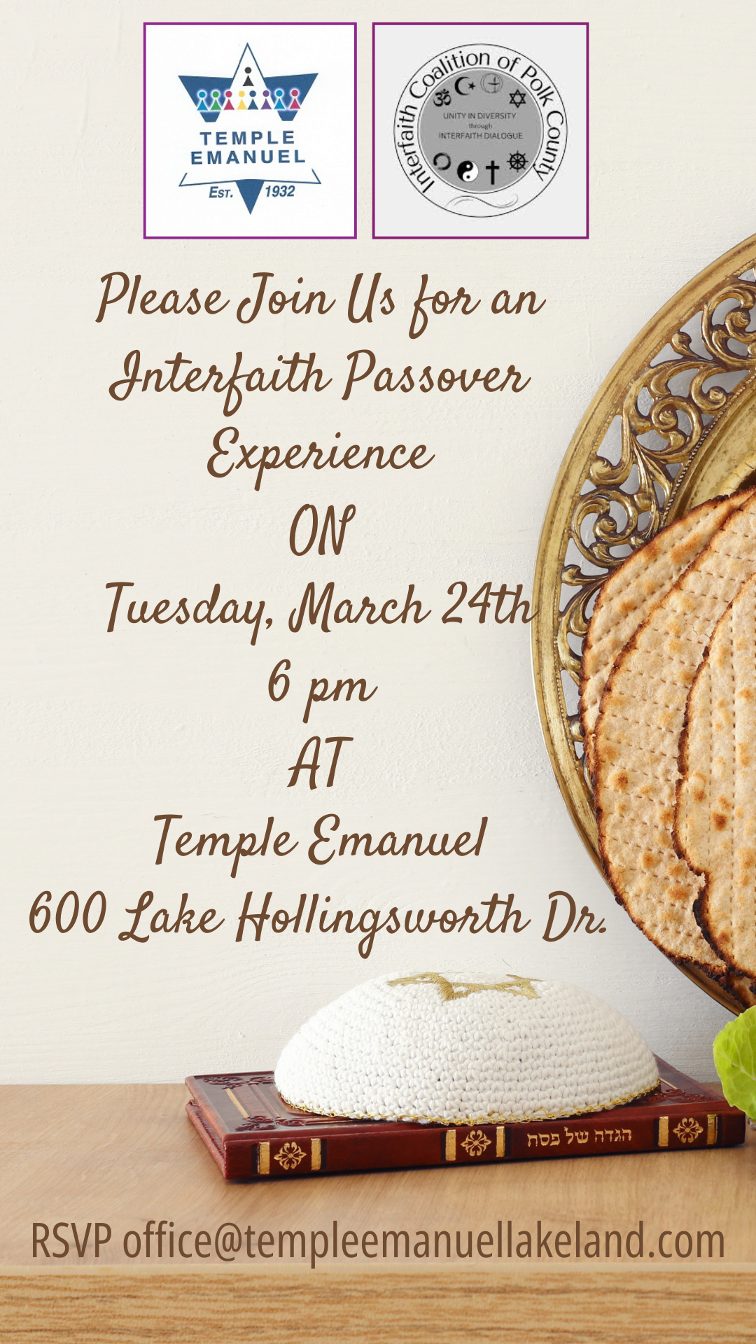 Please join us for an Interfaith Passover Experience on Tuesday March 24th at 6 pm at Temple Emanuel