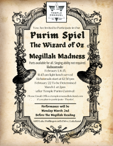 The Purim Spiel will be presented on Monday, March 2nd before the Purim Megillah reading.