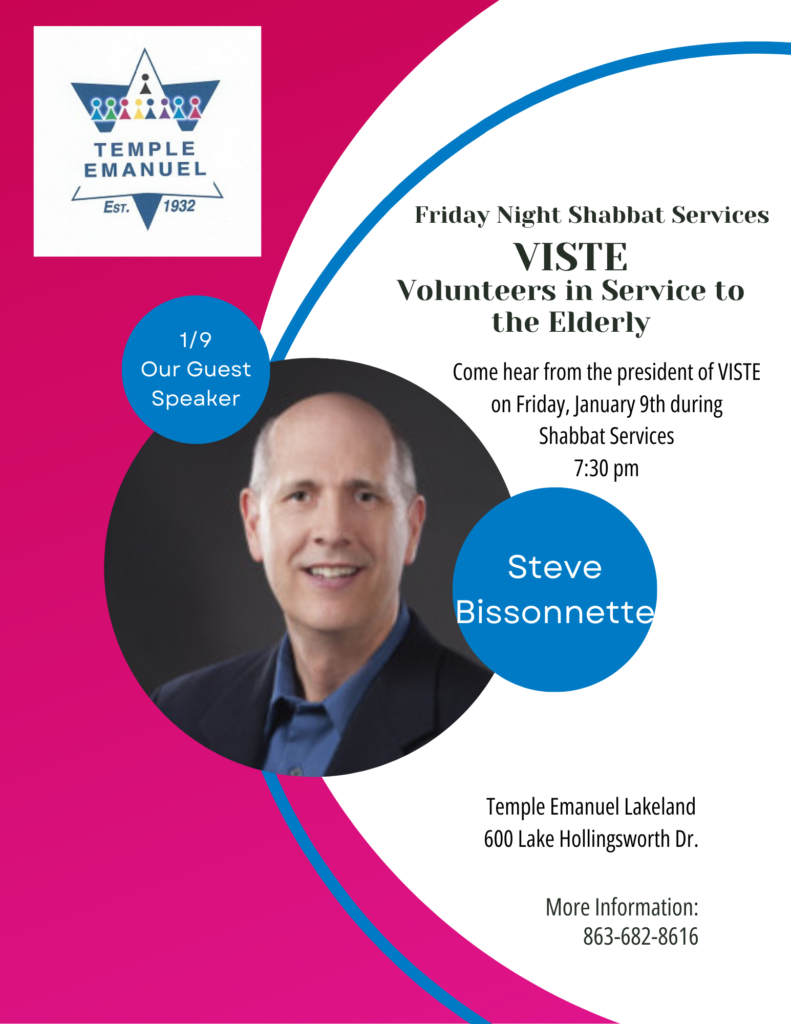 Steve Bissonnette President at VISTE – Volunteers in Service to the Elderly will be our guest speaker at Shabbat services