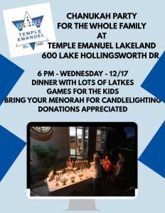 Bring your own Menorah to light at our annual Temple Chanukah Party. There will be latkes and doughnuts and more for dinner.